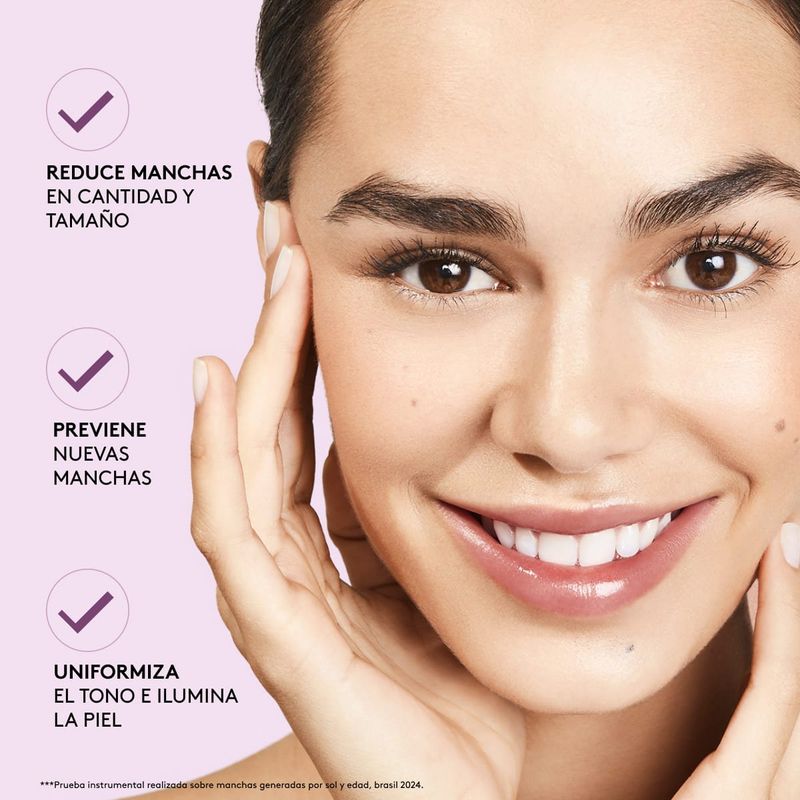 Suero aclarante, 3 beneficios en 1: Reduce y previene manchas, y uniformiza el tono la piel. Capacidad: 28 ml. Tamaño: 10.8x4.10x4.10 cm.